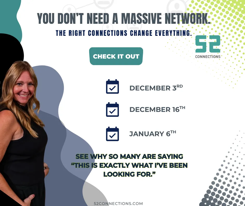 This December in 52 Connections, we’re bringing together opportunities to connect, develop, and make impact. From virtual and In-person networking to Lunch & Learns, Referral Power Hours, and Collaboration Opportunities, every opportunity in 52 Connections is designed to help you intentionally build genuine relationships and strengthen your business community and quality collaborations.